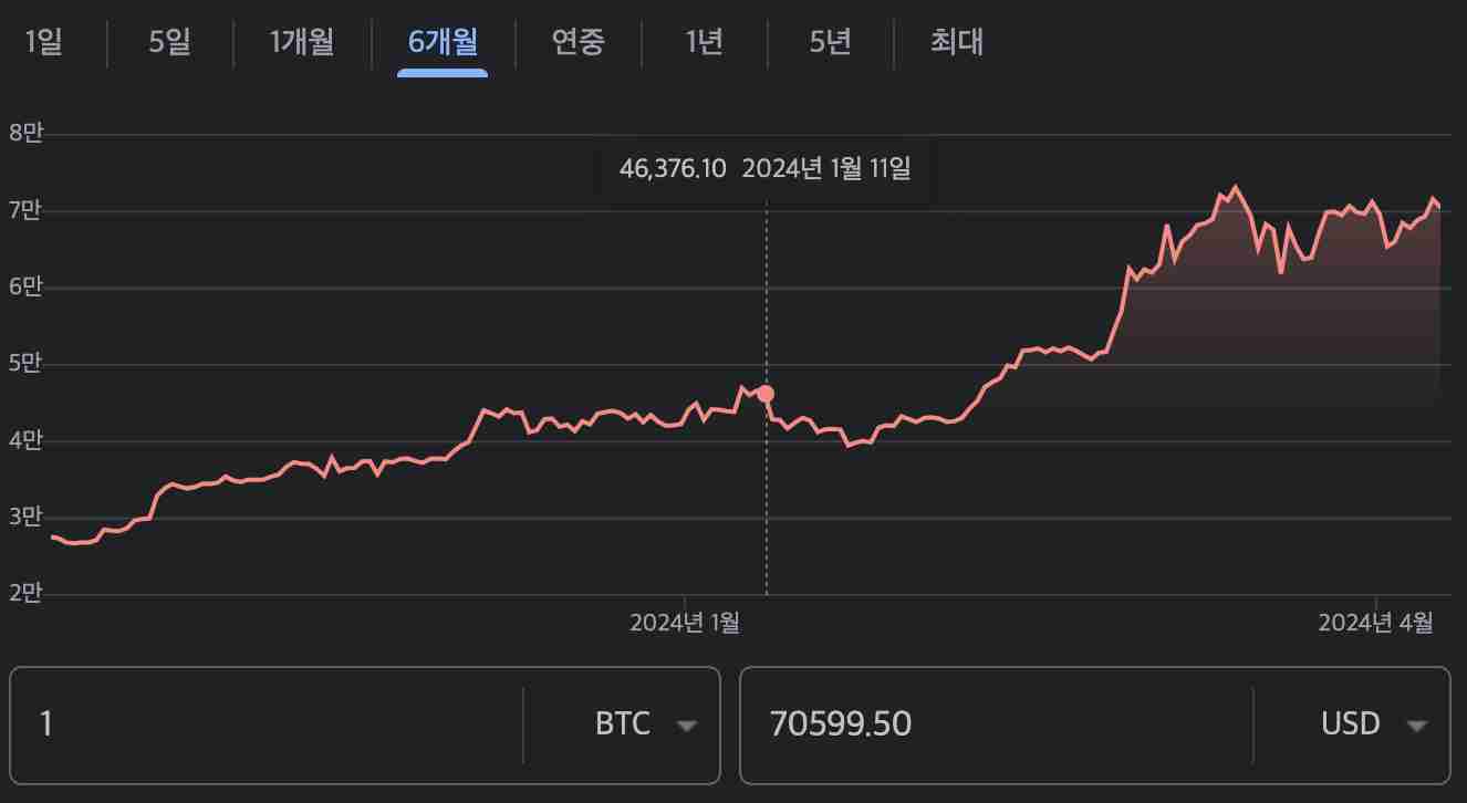 반감기란 원래 어떠한 물질을 구성하는 성분이 절반으로 줄어드는 시간을 의미합니다. 이를 비트코인에 적용하여 채굴 보상이 절반으로 줄어드는 시점을 말하고 있습니다. 네 번째 시점을 2024년 4월 19일로 예상하고 있습니다. 시장에는 투자자들의 기대 심리가 가득하고 현물 ETF 승인으로 거래의 주도권이 바뀌었다는 얘기도 나옵니다.